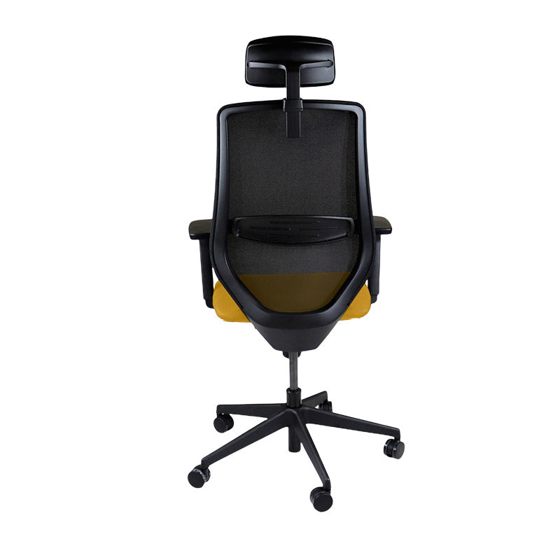 Sachsen: Scudo Arbeitsstuhl mit gelbem Stoffsitz mit Kopfstütze - Generalüberholt